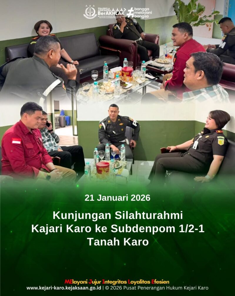Rabu,21 Januari 2026. Kepala Kejaksaan Negeri Karo, Ibu Danke Rajagukguk, S.H, M.Si didampingi Kasi Intelijen, Dona Martinus Sebayang, S.H, M.H dan Kasi Pidsus Dr. Reinhard Harve ,S.H,M.H melakukan kunjungan silaturahmi ke Kantor Subdenpom 1/2-1 Tanah Karo di Desa Raya, Kecamatan Berastagi, Kabupaten Karo.