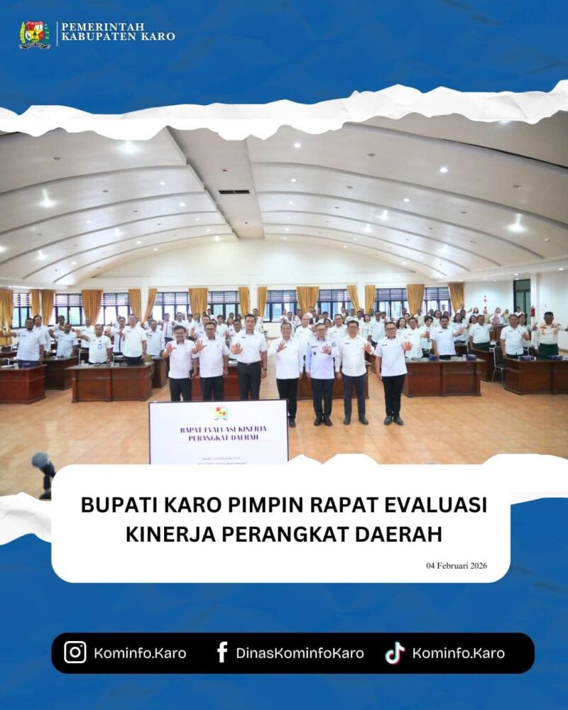 Bupati Karo, Brigjen Pol (Purn) Dr. dr. Antonius Ginting, Sp.OG., M.Kes., didampingi Wakil Bupati Karo, Komando Tarigan, SP., Sekretaris Daerah Kab.Karo, Gelora Kurnia Putra Ginting, S.STP., MM., Para Asisten, serta Inspektur Kab.Karo memimpin Rapat Evaluasi Kinerja Perangkat Daerah yang dilaksanakan di Aula Rakoetta Brahmana (Aula Kantor Bupati Karo), pada Rabu (4/2/2026). Turut dihadiri Oleh Para Kepala OPD dan Para Camat se-Kabupaten Karo.