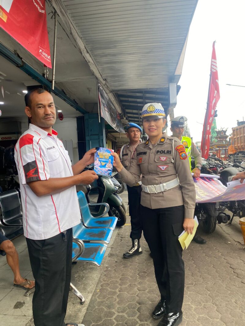 Sebagai bentuk kampanye keselamatan, petugas turut membagikan brosur imbauan dan melakukan penempelan stiker Ops Keselamatan Toba 2026 kepada pengendara.