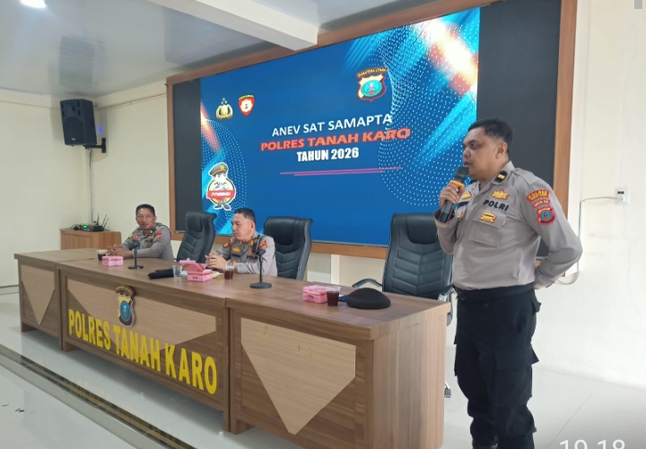 Satuan Samapta Polres Tanah Karo menggelar analisa dan evaluasi (anev) sekaligus rapat penanggulangan bencana alam di wilayah hukumnya, Sabtu (14/2/2026) pukul 10.00 WIB hingga selesai. Kegiatan tersebut dilaksanakan di Aula Pur-Pur Sage Polres Tanah Karo.