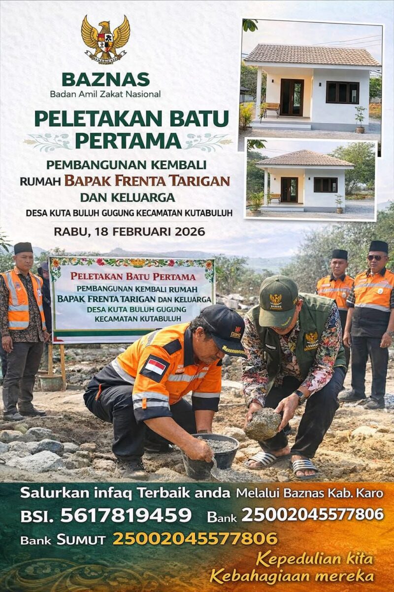 Badan Amil Zakat Nasional (BAZNAS) kembali menunjukkan komitmennya dalam membantu masyarakat melalui program kemanusiaan. Pada hari yang penuh kebersamaan, telah dilaksanakan peletakan batu pertama pembangunan kembali rumah Bapak Frenta Tarigan dan keluarga di Desa Kutabuluh Gugung, Kecamatan Kutabuluh.