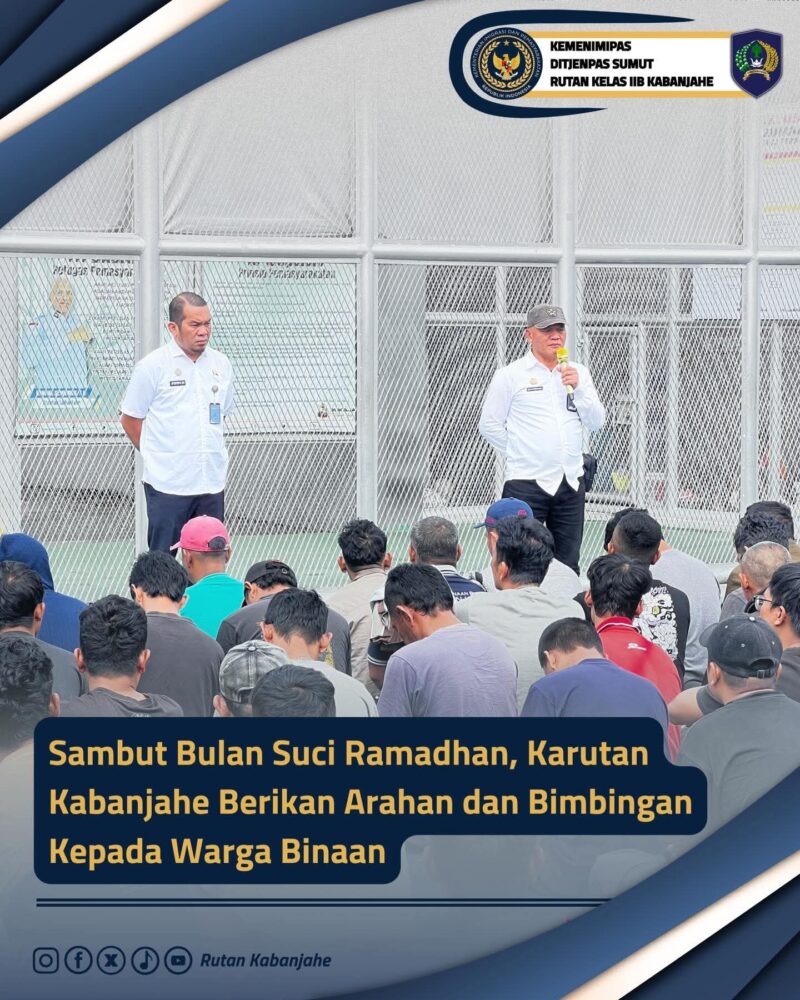 Dalam rangka menyambut Bulan Suci Ramadhan 1447 Hijriah, Kepala Rumah Tahanan Negara Kelas IIB Kabanjahe memberikan arahan dan bimbingan kepada seluruh Warga Binaan Pemasyarakatan (WBP) sebagai bentuk penguatan pembinaan kepribadian dan spiritual di lingkungan rutan.