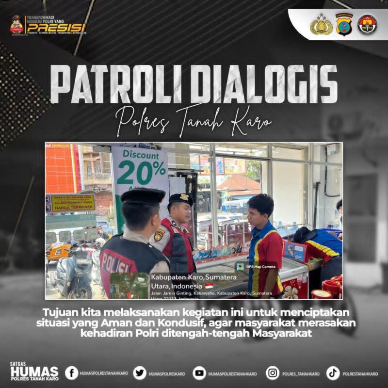 Sat Samapta Polres Tanah Karo melakukan patroli dialogis dan mengantisipasi 3C dan tindak pidana lainnya untuk menciptakan keamanan dan kenyamanan di wilayah hukum Polres Tanah Karo. Patroli ini tidak hanya berfungsi sebagai pengawasan, tetapi juga sebagai sarana untuk berkomunikasi langsung dengan masyarakat.