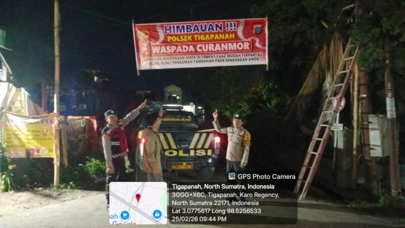 – Dalam upaya mencegah tindak pidana pencurian kendaraan bermotor (curanmor), personel piket Polsek Tigapanah melaksanakan kegiatan pemasangan spanduk imbauan di Pasar Tradisional Desa Tigapanah, Kecamatan Tigapanah, Kabupaten Karo, Rabu(25/2/2026).