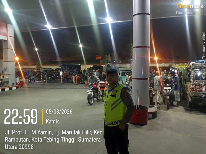 Polres Tebingtinggi bersama jajaran Polsek melaksanakan kegiatan monitoring dan pengamanan di sejumlah SPBU yang mengalami antrian panjang di wilayah hukum Polres Tebingtinggi – Sumut, Kamis malam (5/3/2026).