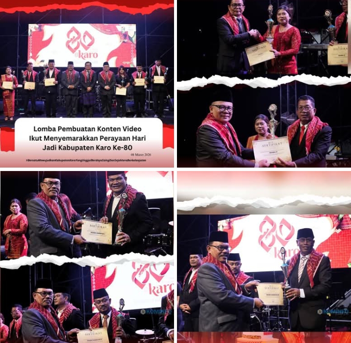 (10 Maret 2025)- Bupati Karo, Brigjen Pol. (Purn) Dr. dr. Antonius Ginting, Sp.OG., M.Kes. menyerahkan Piagam penghargaan Lomba Konten Video pada Puncak Hari Jadi Kabupaten Karo yang ke -80 yang dilaksanakan di Stadion Samura Kabanjahe (8/3/2026).