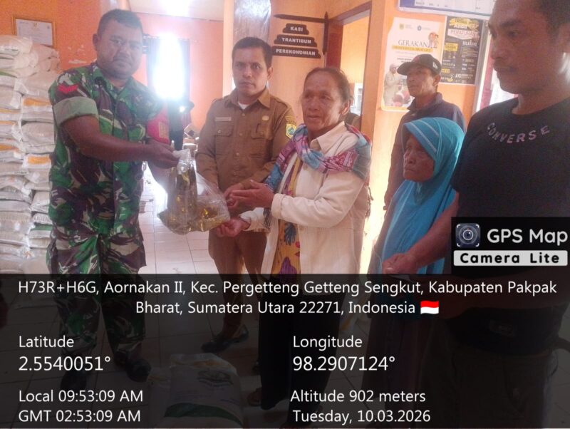 – Personel Babinsa Koramil 07/Salak, Kodim 0206/Dairi, Kopka Naseb Susanto dan Serda Riston Sinaga, turun langsung mendampingi penyaluran bantuan pangan dari Bulog kepada masyarakat di Kecamatan PGGS, Kabupaten Pakpak Bharat, Selasa (10/3/2026). Kehadiran Babinsa dalam kegiatan tersebut bertujuan memastikan proses penyaluran berjalan tertib, aman, dan tepat sasaran.