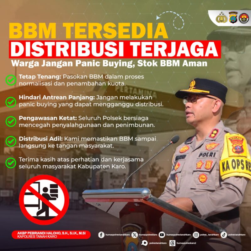 – Kapolres Tanah Karo AKBP Pebriandi Haloho mengimbau masyarakat agar tidak melakukan pembelian bahan bakar minyak (BBM) secara berlebihan atau panic buying.