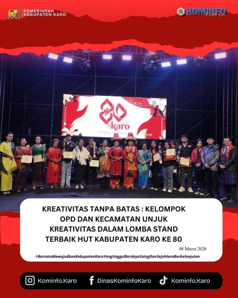 – Bupati Karo, Brigjen Pol (Purn) Dr.dr. Antonius Ginting, Sp.OG.,M.Kes bersama Forkopimda Karo menyerahkan Penghargaan kepada pemenang Lomba Stand Terbaik dalam peringatan hari jadi Kabupaten Karo, Stadion Samura bertransformasi menjadi pusat inovasi dan pameran budaya. Salah satu agenda utama yang paling dinantikan adalah Lomba Stand Terbaik yang diikuti oleh seluruh Organisasi Perangkat Daerah (OPD) dan Kecamatan se-Kabupaten Karo, Minggu (08/03/2026).9