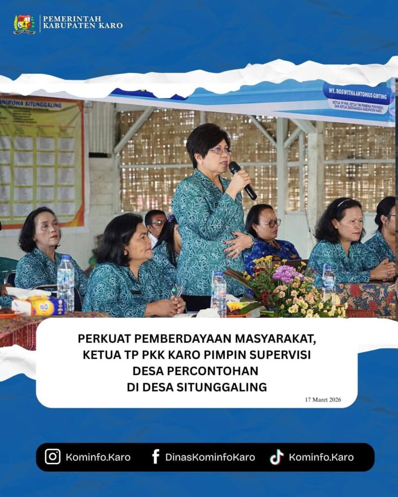 – Ketua Tim Penggerak Pemberdayaan Kesejahteraan Keluarga (TP PKK) Kabupaten Karo, Ny. Roswhita Antonius Ginting, memimpin langsung pelaksanaan Supervisi Lomba Desa Percontohan 10 Program Pokok PKK tingkat Kabupaten Karo di Desa Situnggaling, Kecamatan Merek, Selasa (17/03/2026).