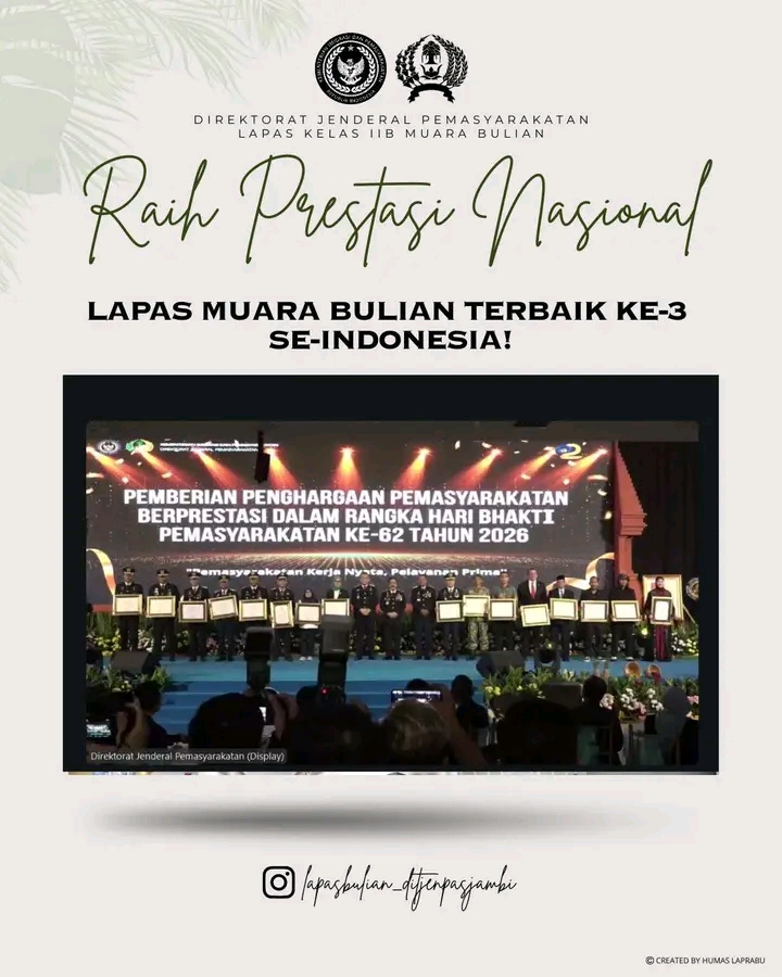 Lembaga Pemasyarakatan (Lapas) Kelas IIB Muara Bulian kembali menorehkan prestasi membanggakan di tingkat nasional. Dalam rangka peringatan Hari Bakti Pemasyarakatan (HBP) ke-62 Tahun 2026, Lapas Muara Bulian berhasil meraih penghargaan sebagai UPT Terbaik ke-3 Nasional, yang diberikan oleh Direktorat Jenderal Pemasyarakatan pada kegiatan tasyakuran yang digelar Senin, 27 April 2026 di Auditorium Prof. Muladi, Kampus Politeknik Imigrasi dan Pemasyarakatan.